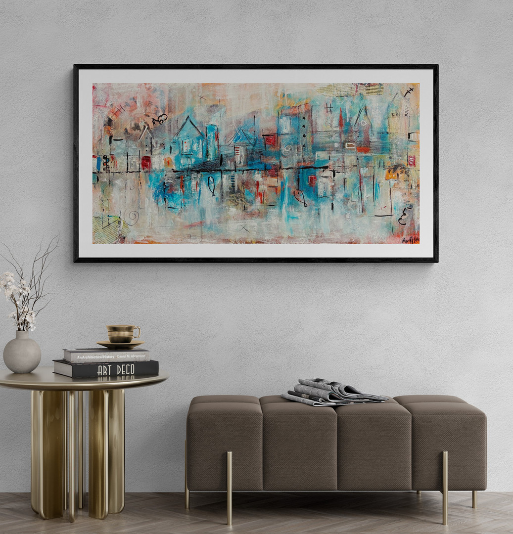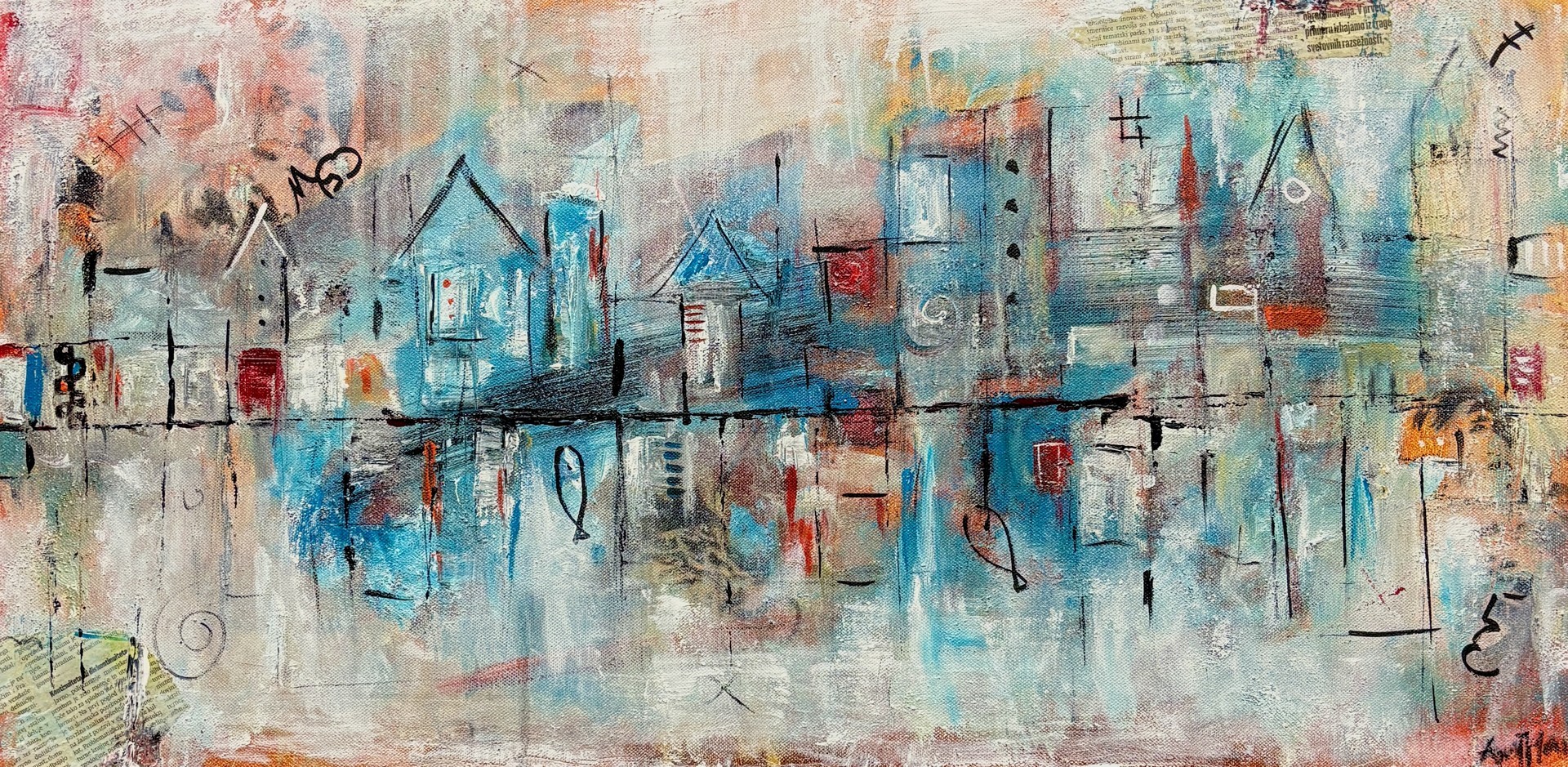 V sliki Fishing Village sem ujela spomin na ribiško vasico ob vodi – odseve, ritem hišic in simbole rib, ki zame pomenijo življenje, mir in povezanost z naravo.