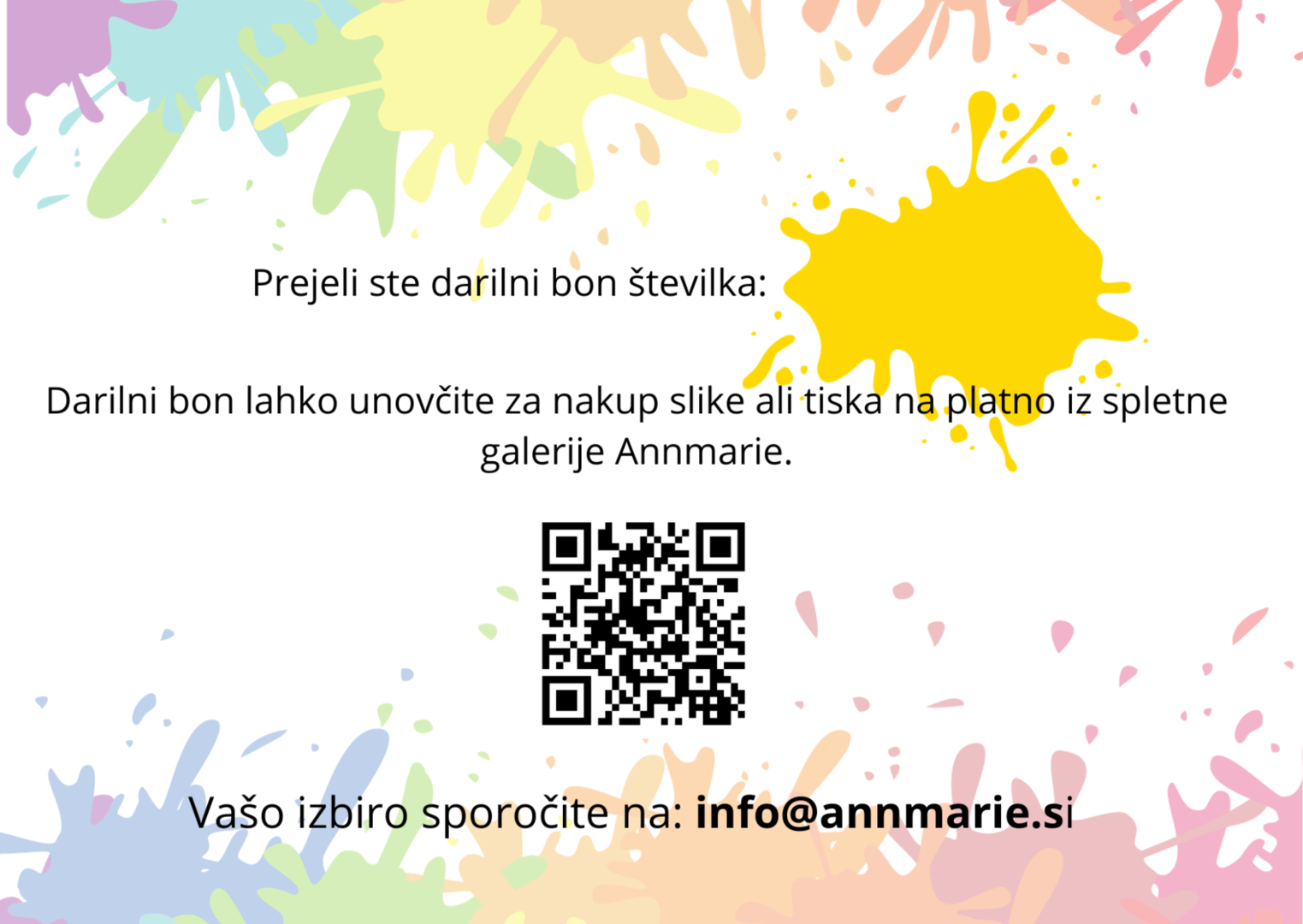 Vrednostni darilni bon, ki ga lahko uporabite za nakup umetniških del v moji spletni trgovini. To je popolno darilo za tiste, ki cenijo lepoto umetnosti in si želijo svoj dom obogatiti z originalnimi umetniškimi deli.